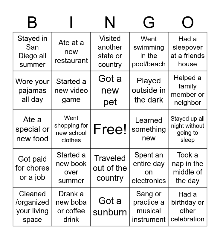 This bingo card has a free space and 24 words: Started a new book over summer, Drank a new boba or coffee drink, Got a new pet, Cleaned /organized your living space, Had a sleepover at a friends house, Stayed in San Diego all summer, Wore your pajamas all day, Ate at a new restaurant, Learned something new, Traveled out of the country, Played outside in the dark, Ate a special or new food, Spent an entire day on electronics, Took a nap in the middle of the day, Started a new video game, Sang or practice a musical instrument, Stayed up all night without going to sleep, Visited another state or country, Helped a family member or neighbor, Went shopping for new school clothes, Had a birthday or other celebration, Got paid for chores or a job, Went swimming in the pool/beach and Got a sunburn.