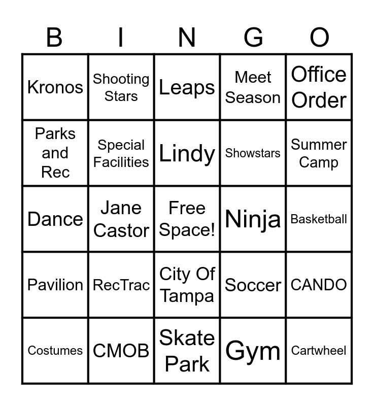 This bingo card has a free space and 24 words: RecTrac, CMOB, Lindy, Costumes, Office Order, Kronos, Parks and Rec, Shooting Stars, Ninja, City Of Tampa, Showstars, Dance, Soccer, CANDO, Special Facilities, Gym, Basketball, Leaps, Summer Camp, Jane Castor, Cartwheel, Pavilion, Meet Season and Skate Park.