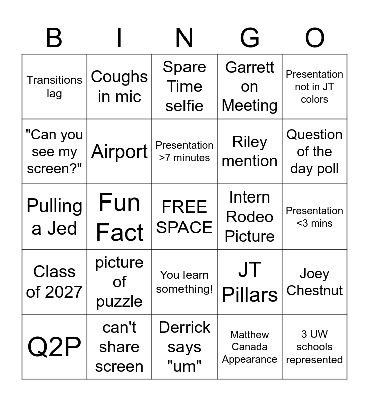 This bingo card has a free space and 24 words: picture of puzzle, can't share screen, Presentation >7 minutes, Q2P, Presentation not in JT colors, Transitions lag, "Can you see my screen?", Coughs in mic, Intern Rodeo Picture, You learn something!, Riley mention, Pulling a Jed, JT Pillars, Joey Chestnut, Airport, Matthew Canada Appearance, Presentation <3 mins, Spare Time selfie, Question of the day poll, Fun Fact, 3 UW schools represented, Class of 2027, Garrett on Meeting and Derrick says "um".
