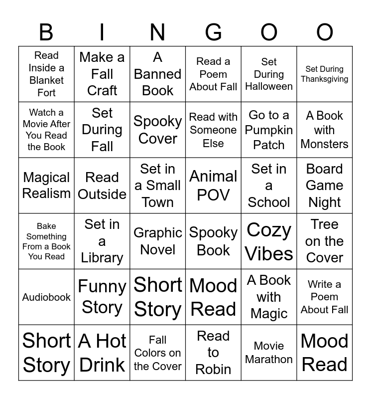 This bingo card has 36 words: Mood Read, Short Story, Read to Robin, Watch a Movie After You Read the Book, Bake Something From a Book You Read, Animal POV, Set During Fall, Fall Colors on the Cover, Set During Halloween, A Book with Magic, A Book with Monsters, Read a Poem About Fall, Write a Poem About Fall, Read Outside, Read with Someone Else, Read Inside a Blanket Fort, Audiobook, Set in a School, Magical Realism, A Banned Book, Set in a Small Town, Set in a Library, Spooky Book, Graphic Novel, Cozy Vibes, Make a Fall Craft, Go to a Pumpkin Patch, A Hot Drink, Spooky Cover, Set During Thanksgiving, Mood Read, Short Story, Tree on the Cover, Board Game Night, Funny Story and Movie Marathon.