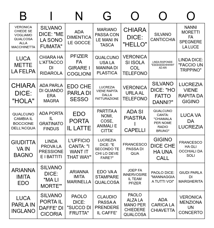 This bingo card has 49 words: PAOLO DICE: "MANNAGGIA A TUTTI VOI", LINDA RISPONDE: "EEEEEEEEHHHHH" AD ARI, PAOLO ALZA LA MANO PER CHIEDERE QUALCOSA, ADA PORTA IL GRATINATO FINDUS, EDO CHE PARLA DI SESSO, LUCA VA DA LUCREZIA, SILVANO DICE: "ME LA SONO FUMATA", PAOLO DICE: "SUCCO DI FRUTTA", SILVANO CANTICCHIA, LUCREZIA DICE: "E SECONDO TE CHI LO DEVE FARE?", NANNI MORETTI FA SPEGNERE LA LUCE, MARIANO PASSA CON LE MANI IN TASCA, SILVANO DICE: "HO FATTO DANNI?", VERONICA URLA AL TELEFONO, SILVANO DICE: "MA LI MORTE'", QUALCUNO CANTA: "CHIAMALA PER NOME RADIO BRUNO", LUCA METTE LA FELPA, LINDA DICE: "FACCIO UN TRIPPINO", GIUDI PARLA DI MARGHERITA, CHIARA DICE: "HELLO", VERONICA SI ISOLA COL TELEFONO, EDO PORTA IL LATTE, VERONICA CHIEDE SE VOGLIAMO QUALCOSA ALLA MACCHINETTA, CHIARA HA L'ATTACCO DI RIDAROLA, LUCA PARLA IN INGLANO, PFIZER FA GIRARE I COGLIONI, LUCREZIA VIENE RAPITA DA GIGINO, SILVANO PORTA IL DAFFE' DI CICORIA, LUCREZIA VIENE RAPITA DALLA FATTURAZIONE, ADA PARLA DI QUANDO ERA MAGRA, VERONICA MENZIONA UN CONCERTO, ADA SI PIASTRA I CAPELLI, ARIANNA IMITA EDO, ARIANNA IMITA MARINELLA, QUALCUNO CAMBIA IL BOCCIONE DELL'ACQUA, FRANCESCO PASSA DI QUA, GIGINO DICE CHE HA UNA CALL, FRANCESCO HA GLI OCCHIALI DA SOLI, CHIARA DICE: "HOLA", L'UFFICIO CANTA: "I WANT IT THAT WAY", EDO VA A STAMPARE QUALCOSA, GIUDITTA VA IN BAGNO, PARTITA A NOMI, COSE, ANIMALI E CITTA', CLAUDIO PASSA A PRENDERE IL CAFFE', QUALCUNO USA LA MANINA DI PLASTICA, ADA DIMENTICA LE GOCCE, JOEP FA INNERVOSIRE IL TEAM PFIZER, LINDA PROVA LA PRESSIONE E I BATTITI and ADA CARICA LA CHIAVETTA.