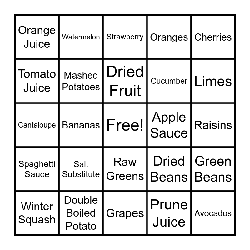 This bingo card has a free space and 39 words: Apple, Lettuce, Salt Free Seasonings, Mashed Potatoes, Winter Squash, Raw Greens, Dried Fruit, Lemons, Cherries, Spaghetti Sauce, Bananas, Oranges, Avocados, Raisins, Apple Sauce, Salt Substitute, Beets, Orange Juice, Prunes, Dried Beans, Tomato Juice, Grapes, Cucumber, Limes, Banana Smoothie, Pumpkin, Tomatoes, Pineapple, Blueberry, Watermelon, Apple Juice, Sweet Potatoes, Strawberry, Double Boiled Potato, Prune Juice, Cranberry Juice, Green Beans, Cantaloupe and Okra.