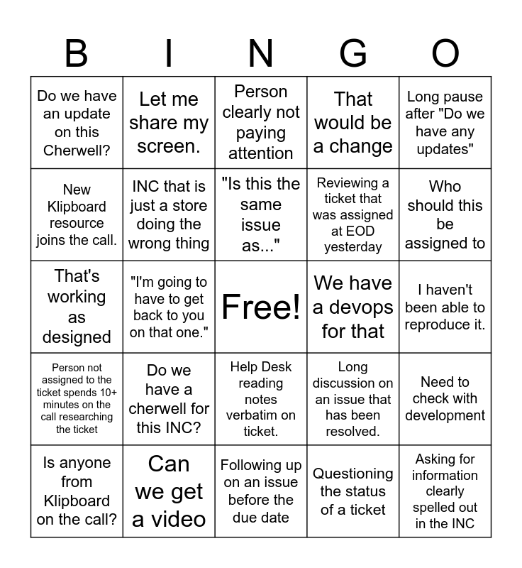 This bingo card has a free space and 24 words: Do we have a cherwell for this INC?, Can we get a video, "Is this the same issue as...", Is anyone from Klipboard on the call?, Long pause after "Do we have any updates", Do we have an update on this Cherwell?, New Klipboard resource joins the call., Let me share my screen., We have a devops for that, Help Desk reading notes verbatim on ticket., Reviewing a ticket that was assigned at EOD yesterday, That's working as designed, Long discussion on an issue that has been resolved., Need to check with development, INC that is just a store doing the wrong thing, Questioning the status of a ticket, I haven't been able to reproduce it., Person clearly not paying attention, Who should this be assigned to, "I'm going to have to get back to you on that one.", Asking for information clearly spelled out in the INC, Person not assigned to the ticket spends 10+ minutes on the call researching the ticket, That would be a change and Following up on an issue before the due date.