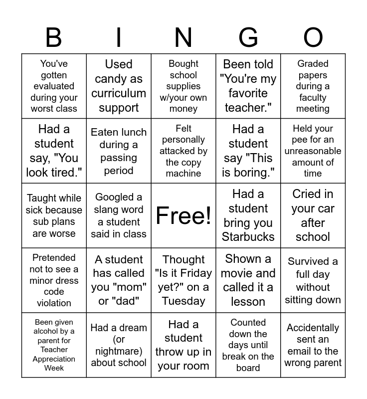 This bingo card has a free space and 24 words: A student has called you "mom" or "dad", Had a dream (or nightmare) about school, Felt personally attacked by the copy machine, Been given alcohol by a parent for Teacher Appreciation Week, Graded papers during a faculty meeting, You've gotten evaluated during your worst class, Had a student say, "You look tired.", Used candy as curriculum support, Had a student bring you Starbucks, Thought "Is it Friday yet?" on a Tuesday, Had a student say "This is boring.", Taught while sick because sub plans are worse, Shown a movie and called it a lesson, Survived a full day without sitting down, Eaten lunch during a passing period, Counted down the days until break on the board, Cried in your car after school, Bought school supplies w/your own money, Held your pee for an unreasonable amount of time, Googled a slang word a student said in class, Accidentally sent an email to the wrong parent, Pretended not to see a minor dress code violation, Been told "You're my favorite teacher." and Had a student throw up in your room.