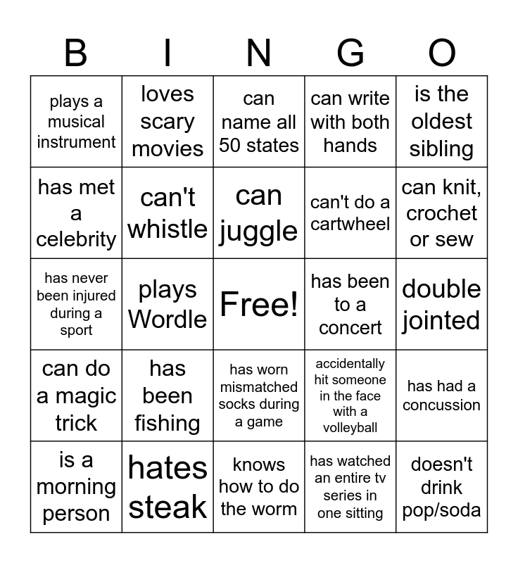 This bingo card has a free space and 24 words: has been fishing, hates steak, can juggle, is a morning person, is the oldest sibling, plays a musical instrument, has met a celebrity, loves scary movies, has been to a concert, has worn mismatched socks during a game, can't do a cartwheel, has never been injured during a sport, accidentally hit someone in the face with a volleyball, has had a concussion, can't whistle, has watched an entire tv series in one sitting, double jointed, can name all 50 states, can knit, crochet or sew, plays Wordle, doesn't drink pop/soda, can do a magic trick, can write with both hands and knows how to do the worm.