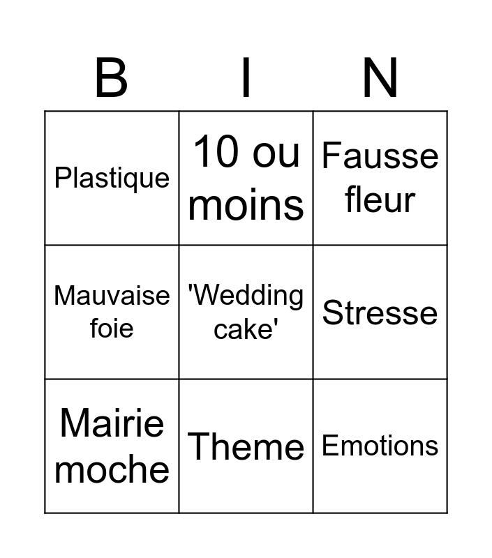 This bingo card has a free space and 8 words: Stresse, Fausse fleur, 10 ou moins, Mairie moche, Plastique, Emotions, Mauvaise foie and Theme.