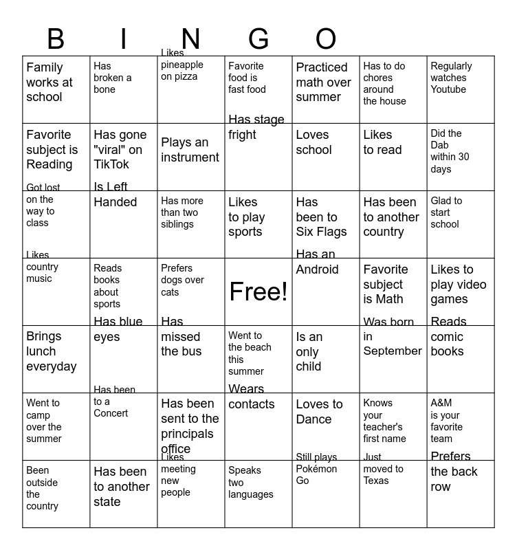 This bingo card has a free space and 48 words: Loves to Dance, Likes to read, Speaks two languages, Reads books about sports, Has more than two siblings, Likes to play video games, Has broken a bone, Has been to another state, Has to do chores around the house, Went to the beach this summer, Regularly watches Youtube, Favorite food is fast food, Has been to another country, Has been to Six Flags, Went to camp over the summer, Favorite subject is Math, Favorite subject is Reading, Did the Dab within 30 days, Knows your teacher's first name, Practiced math over summer, Loves school, Prefers dogs over cats, Family works at school, Has gone "viral" on TikTok, A&M is your favorite team, Plays an instrument, Glad to start school, Been outside the country, Likes to play sports, Is Left Handed, Just moved to Texas, Has an Android, Reads comic books, Has been to a Concert, Likes country music, Is an only child, Was born in September, Got lost on the way to class, Has missed the bus, Has been sent to the principals office, Brings lunch everyday, Prefers the back row, Likes pineapple on pizza, Likes meeting new people, Has stage fright, Wears contacts, Has blue eyes and Still plays Pokémon Go.