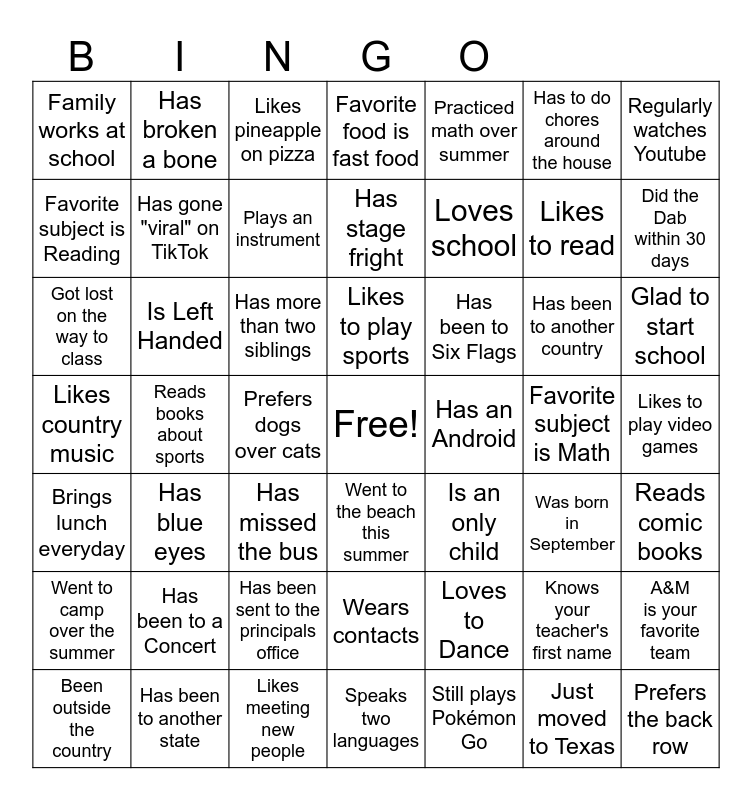 This bingo card has a free space and 48 words: Loves to Dance, Likes to read, Speaks two languages, Reads books about sports, Has more than two siblings, Likes to play video games, Has broken a bone, Has been to another state, Has to do chores around the house, Went to the beach this summer, Regularly watches Youtube, Favorite food is fast food, Has been to another country, Has been to Six Flags, Went to camp over the summer, Favorite subject is Math, Favorite subject is Reading, Did the Dab within 30 days, Knows your teacher's first name, Practiced math over summer, Loves school, Prefers dogs over cats, Family works at school, Has gone "viral" on TikTok, A&M is your favorite team, Plays an instrument, Glad to start school, Been outside the country, Likes to play sports, Is Left Handed, Just moved to Texas, Has an Android, Reads comic books, Has been to a Concert, Likes country music, Is an only child, Was born in September, Got lost on the way to class, Has missed the bus, Has been sent to the principals office, Brings lunch everyday, Prefers the back row, Likes pineapple on pizza, Likes meeting new people, Has stage fright, Wears contacts, Has blue eyes and Still plays Pokémon Go.