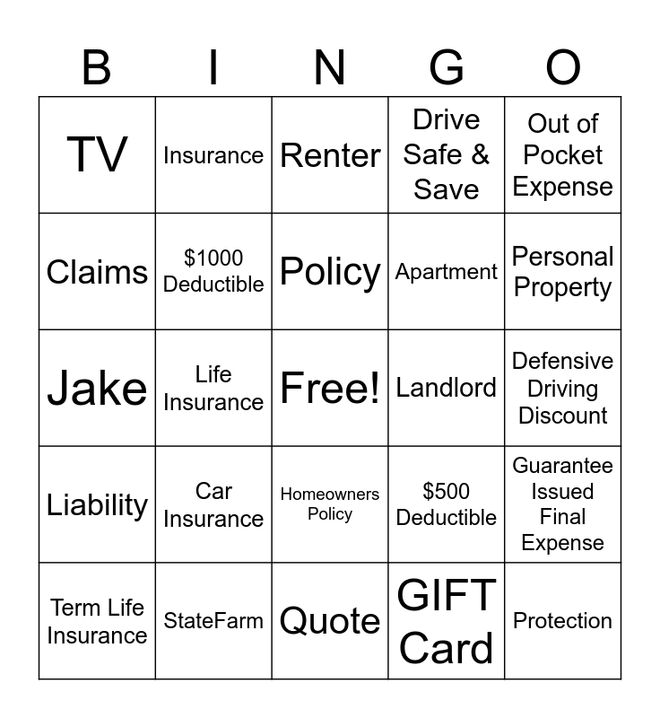This bingo card has a free space and 24 words: Car Insurance, StateFarm, Policy, Term Life Insurance, Out of Pocket Expense, TV, Claims, Insurance, Landlord, Homeowners Policy, Apartment, Jake, $500 Deductible, Guarantee Issued Final Expense, $1000 Deductible, GIFT Card, Defensive Driving Discount, Renter, Personal Property, Life Insurance, Protection, Liability, Drive Safe & Save and Quote.