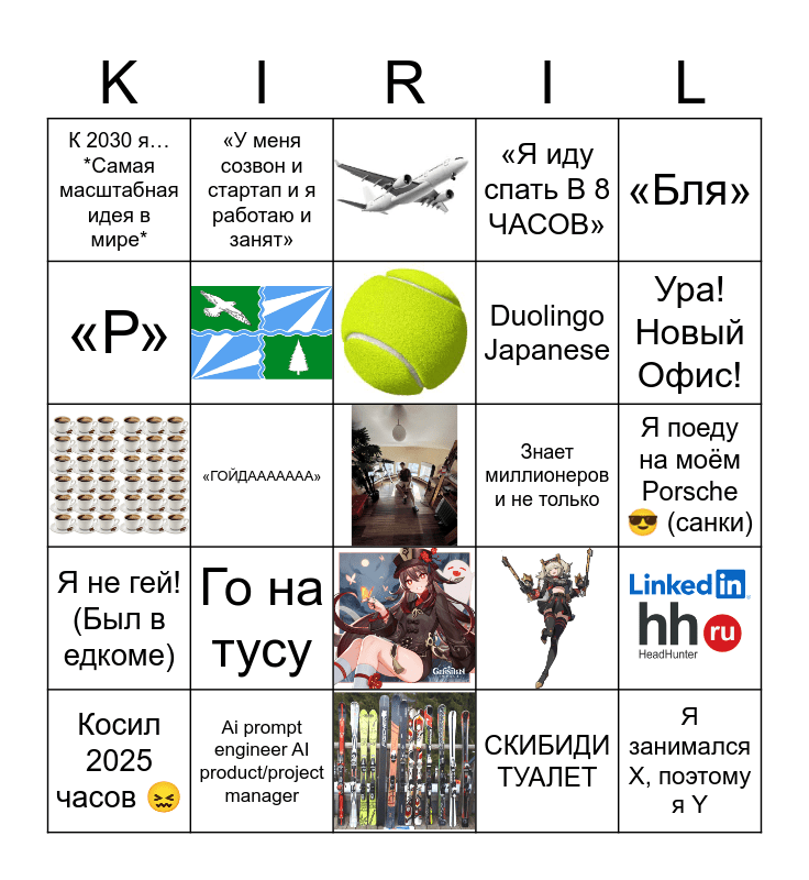This bingo card has 8 images, a free space and 16 words: Косил 2025 часов 😖, Го на тусу, СКИБИДИ ТУАЛЕТ, «Бля», К 2030 я…*Самая масштабная идея в мире*, «У меня созвон и стартап и я работаю и занят», Знает миллионеров и не только, Я поеду на моём Porsche 😎 (санки), «Р», Ai prompt engineer AI product/project manager, «Я иду спать В 8 ЧАСОВ», Ура! Новый Офис!, Я не гей! (Был в едкоме), «ГОЙДААААААА», Duolingo Japanese and Я занимался Х, поэтому я Y.