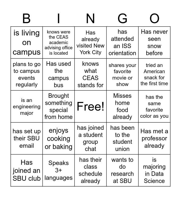 This bingo card has a free space and 29 words: is majoring in Computer Science, Speaks 3+ languages, Has already visited New York City, Is from the same country as you, Has never seen snow before, is living on campus, Has used the campus bus, knows what CEAS stands for, Misses home food already, Has met a professor already, Has joined an SBU club, Brought something special from home, wants to do research at SBU, is majoring in Data Science, is an engineering major, visited the SBU bookstore, has their class schedule already, has been to the student union, tried an American snack for the first time, has set up their SBU email, enjoys cooking or baking, loves gaming or coding, shares your favorite movie or show, has the same favorite color as you, plans to go to campus events regularly, knows were the CEAS academic advising office is located, has joined a student group chat, has attended an ISS orientation and traveled more than 20 hours to get here.