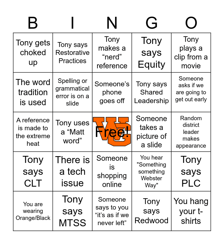 This bingo card has a free space and 24 words: There is a tech issue, Tony says MTSS, Someone’s phone goes off, You are wearing Orange/Black, Tony plays a clip from a movie, Tony gets choked up, The word tradition is used, Tony says Restorative Practices, Someone takes a picture of a slide, Someone is shopping online, Tony says Shared Leadership, A reference is made to the extreme heat, You hear "Something something Webster Way", Tony says PLC, Spelling or grammatical error is on a slide, Tony says Redwood, Random district leader makes appearance, Tony makes a “nerd” reference, Someone asks if we are going to get out early, Tony uses a “Matt word”, You hang your t-shirts, Tony says CLT, Tony says Equity and Someone says to you “it’s as if we never left”.