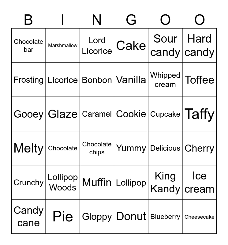 This bingo card has 64 words: ImprovCare!, Lollipop, Gumdrop, Chocolate, Candy cane, Gummy bear, Marshmallow, Jellybean, Licorice, Cotton candy, Taffy, Fudge, Caramel, Sour candy, Gumball, Hard candy, Toffee, Chocolate bar, Mint, Bonbon, Cupcake, Cookie, Cake, Ice cream, Brownie, Donut, Pie, Sundae, Muffin, Cheesecake, Pudding, Macaron, Churro, Cone, Vanilla, Chocolate chips, Rainbow sprinkles, Cherry, Blueberry, Frosting, Whipped cream, Glaze, Syrup, Sweet, Sticky, Gooey, Yummy, Crunchy, Melty, Colorful, Sugary, Swirly, Delicious, King Kandy, 56., Queen Frostine, Lord Licorice, Princess Lolly, Gloppy, Mr. Mint, Ice Cream Sea, Gumdrop Mountains, Lollipop Woods and Candy Castle.