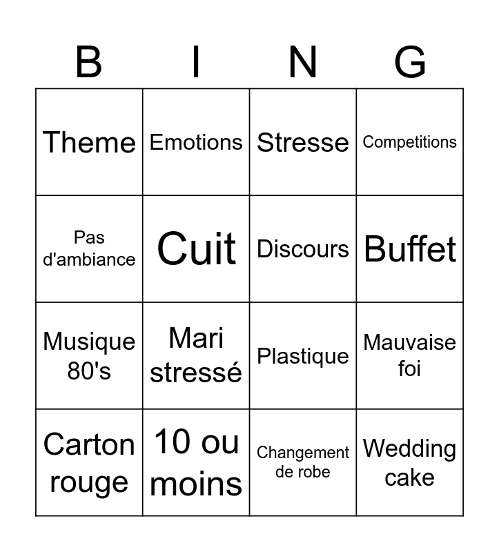 This bingo card has 16 words: 10 ou moins, Mauvaise foi, Stresse, Theme, Musique 80's, Emotions, Plastique, Changement de robe, Pas d'ambiance, Cuit, Carton rouge, Competitions, Mari stressé, Buffet, Discours and Wedding cake.