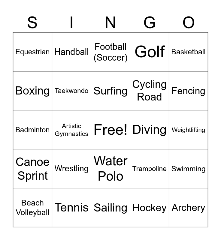 This bingo card has a free space and 24 words: Wrestling, Tennis, Surfing, Beach Volleyball, Basketball, Equestrian, Boxing, Handball, Diving, Water Polo, Cycling Road, Badminton, Trampoline, Swimming, Taekwondo, Hockey, Weightlifting, Football (Soccer), Fencing, Artistic Gymnastics, Archery, Canoe Sprint, Golf and Sailing.