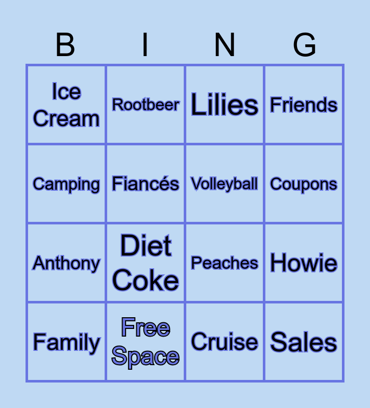 This bingo card has 16 words: Free Space, Howie, Lilies, Ice Cream, Anthony, Rootbeer, Peaches, Cruise, Camping, Fiancés, Family, Friends, Diet Coke, Coupons, Volleyball and Sales.