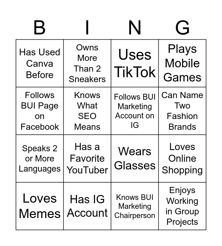 This bingo card has 16 words: Has IG Account, Loves Online Shopping, Uses TikTok, Has Used Canva Before, Speaks 2 or More Languages, Owns More Than 2 Sneakers, Wears Glasses, Knows BUI Marketing Chairperson, Follows BUI Page on Facebook, Knows What SEO Means, Loves Memes, Plays Mobile Games, Has a Favorite YouTuber, Can Name Two Fashion Brands, Follows BUI Marketing Account on IG and Enjoys Working in Group Projects.