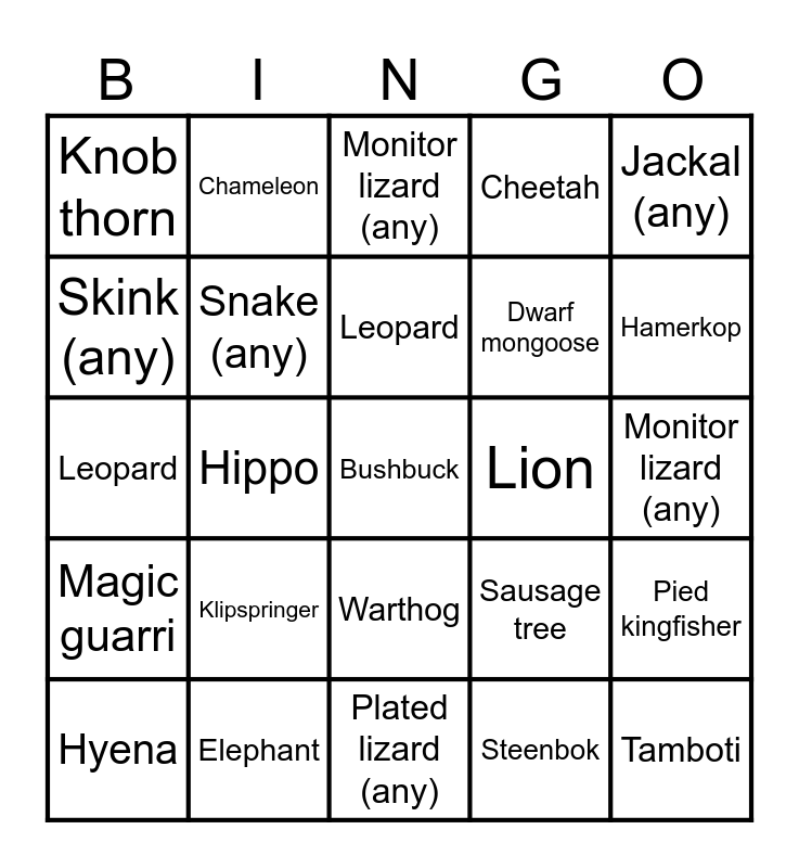 This bingo card has 73 words: Free!, Marula, Knob thorn, Buffalo-thorn, Leadwood, Jackalberry, Magic guarri, Sycamore fig, Sausage tree, Weeping boerbean, Tamboti, Candelabra-tree, Snake (any), Monitor lizard (any), Crocodile, Chameleon, Plated lizard (any), Skink (any), Terrapin (any), Lion, Leopard, Cheetah, Jackal (any), Wild dog, Hyena, Genet (any), Honey badger, Baboon, Monkey, Rhino (any), Elephant, Zebra, Giraffe, Buffalo, Hippo, Warthog, Kudu, Waterbuck, Bushbuck, Duiker, Steenbok, Klipspringer, Scrub hare, Squirrel, Slender mongoose, Dwarf mongoose, Monitor lizard (any), Crocodile, Lion, Leopard, Wild dog, Hyena, Monkey, Rhino (any), Elephant, Zebra, Buffalo, Warthog, Kudu, Waterbuck, Squirrel, Egyptian Goose, Saddle-billed stork, Hamerkop, Goliath heron, Fish eagle, Hooded vulture, Owl (any), Pied kingfisher, Little bee-eater, Southern ground hornbill, Magpie shrike and Blue waxbill.