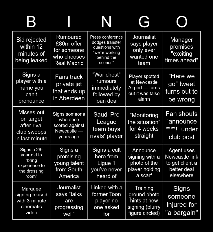 This bingo card has 25 words: Signs a promising young talent from South America, Linked with a former Toon player no one asked for, "War chest" rumours immediately followed by loan deal, Marquee signing teased with 3-minute cinematic video, Manager promises "exciting times ahead", Bid rejected within 12 minutes of being leaked, Signs a player with a name you can't pronounce, Rumoured £80m offer for someone who chooses Real Madrid, "Monitoring the situation" for 4 weeks straight, Signs a cult hero from Ligue 1 you’ve never heard of, Player spotted at Newcastle Airport — turns out it was false alarm, Misses out on target after rival club swoops in last minute, Announce signing with a photo of the player holding a scarf, Agent uses Newcastle link to get client a better deal elsewhere, Fans track private jet that ends up in Aberdeen, Signs someone injured for "a bargain", Fan shouts “announce ****!” under club post, Press conference dodges transfer questions with “we're working behind the scenes”, "Here we go" tweet turns out to be wrong, Signs someone who once scored against Newcastle — years ago, Saudi Pro League team buys rivals' player, Journalist says "talks are progressing well", Signs a 28-year-old to “bring experience to the dressing room”, Journalist says player only ever wanted one team and Training ground photo hints at new signing (blurry figure circled).
