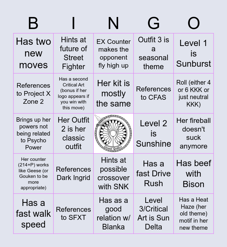 This bingo card has a free space and 24 words: References Dark Ingrid, References to SFXT, Her kit is mostly the same, Has a fast walk speed, Level 1 is Sunburst, Has two new moves, References to Project X Zone 2, Hints at future of Street Fighter, Level 2 is Sunshine, Hints at possible crossover with SNK, References to CFAS, Brings up her powers not being related to Psycho Power, Has a fast Drive Rush, Has beef with Bison, Has a second Critical Art (bonus if her logo appears if you win with this move), Level 3/Critical Art is Sun Delta, Her fireball doesn't suck anymore, EX Counter makes the opponent fly high up, Roll (either 4 or 6 KKK or just neutral KKK), Her Outfit 2 is her classic outfit, Has a Heat Haze (her old theme) motif in her new theme, Her counter (214+P) works like Geese (or Gouken to be more appropriate), Outfit 3 is a seasonal theme and Has as a good relation w/ Blanka.