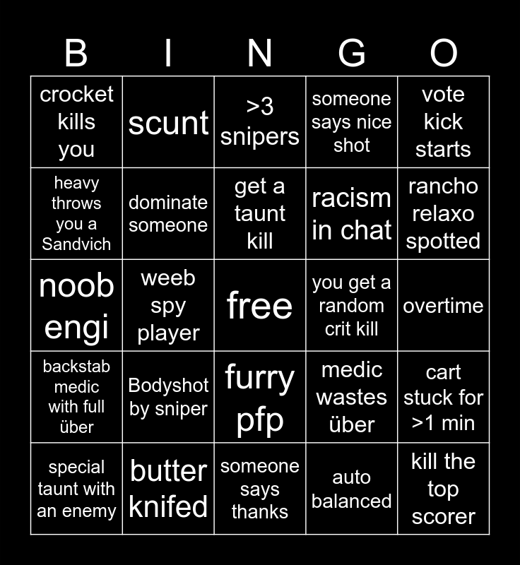 This bingo card has a free space and 24 words: Bodyshot by sniper, butter knifed, get a taunt kill, special taunt with an enemy, vote kick starts, crocket kills you, heavy throws you a Sandvich, scunt, you get a random crit kill, furry pfp, racism in chat, noob engi, medic wastes über, cart stuck for >1 min, dominate someone, auto balanced, overtime, >3 snipers, rancho relaxo spotted, weeb spy player, kill the top scorer, backstab medic with full über, someone says nice shot and someone says thanks.