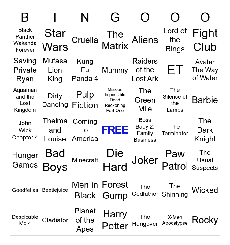 This bingo card has a free space and 48 words: The Godfather, ET, Harry Potter, Thelma and Louise, Pulp Fiction, The Dark Knight, Star Wars, Gladiator, Lord of the Rings, Die Hard, Fight Club, The Matrix, The Silence of the Lambs, The Green Mile, Goodfellas, The Terminator, Saving Private Ryan, Avatar The Way of Water, The Shinning, Aliens, Raiders of the Lost Ark, Coming to America, Black Panther Wakanda Forever, Mufasa Lion King, Wicked, Kung Fu Panda 4, Barbie, Despicable Me 4, Mission Impossible Dead Reckoning Part One, Dirty Dancing, X-Men Apocalypse, Boss Baby 2: Family Business, The Usual Suspects, Beetlejuice, John Wick Chapter 4, Joker, Paw Patrol, Aquaman and the Lost Kingdom, Minecraft, Men in Black, Hunger Games, Rocky, Cruella, Planet of the Apes, Mummy, Forest Gump, Bad Boys and The Hangover.