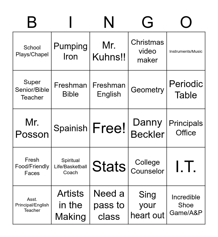 This bingo card has a free space and 25 words: Asst. Principal/English Teacher, Spiritual Life/Basketball Coach, Freshman English, Sing your heart out, Periodic Table, School Plays/Chapel, Pumping Iron, Mr. Kuhns!!, Geometry, I.T., Mr. Posson, Freshman Bible, College Counselor, Incredible Shoe Game/A&P, Super Senior/Bible Teacher, Artists in the Making, Need a pass to class, Christmas video maker, Principals Office, Fresh Food/Friendly Faces, Spainish, Stats, Danny Beckler, Instruments/Music and Bump Set Spike.