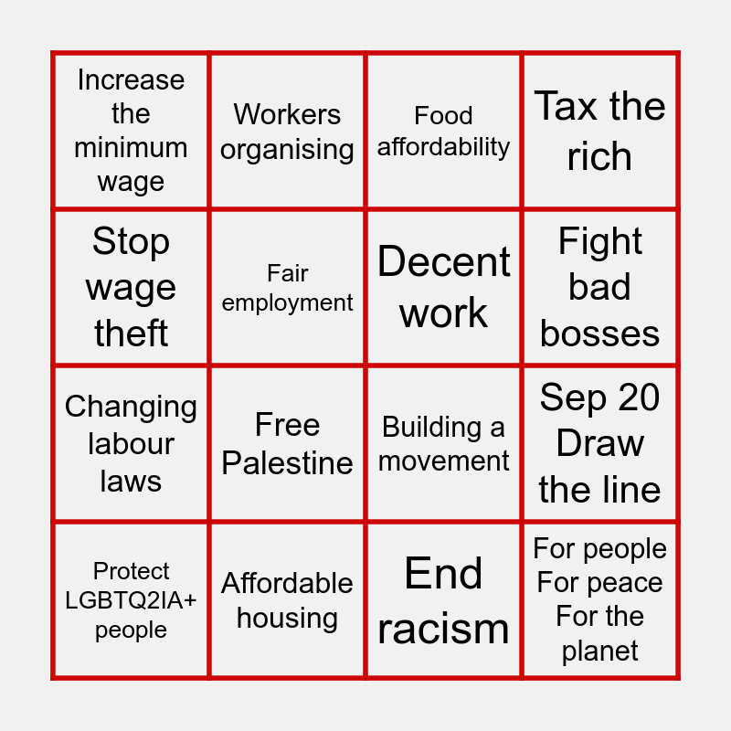 This bingo card has 24 words: Status for All, Health for All, Fight bad bosses, Justice for workers, Stop wage theft, Increase the minimum wage, Fair employment, Workers organising, Affordable housing, Stop bill C-2, Changing labour laws, Building a movement, Protecting workers' rights, Dignity & Fairness, Decent work, Better jobs, End racism, Food affordability, Free Palestine, Sep 20 Draw the line, Protect LGBTQ2IA+ people, For people For peace For the planet, Tax the rich and End fossil fuels.