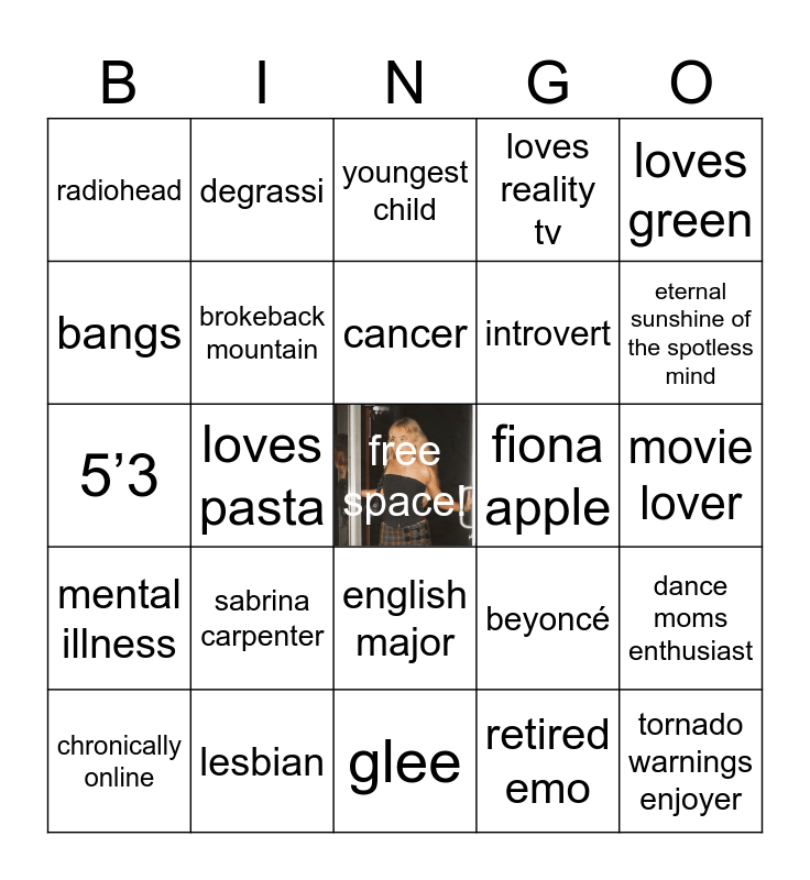 This bingo card has a free space and 24 words: sabrina carpenter, lesbian, cancer, chronically online, loves green, radiohead, bangs, degrassi, fiona apple, english major, introvert, 5’3, beyoncé, dance moms enthusiast, brokeback mountain, retired emo, movie lover, youngest child, eternal sunshine of the spotless mind, loves pasta, tornado warnings enjoyer, mental illness, loves reality tv and glee.
