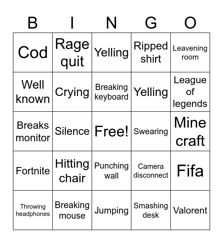 This bingo card has a free space and 24 words: Hitting chair, Breaking mouse, Breaking keyboard, Throwing headphones, Leavening room, Cod, Well known, Rage quit, Swearing, Punching wall, Yelling, Breaks monitor, Camera disconnect, Fifa, Crying, Smashing desk, Mine craft, Yelling, League of legends, Silence, Valorent, Fortnite, Ripped shirt and Jumping.