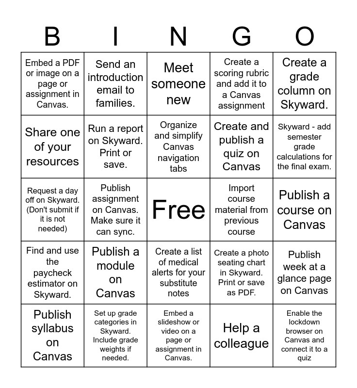 This bingo card has a free space and 24 words: Publish a module on Canvas, Set up grade categories in Skyward. Include grade weights if needed., Organize and simplify Canvas navigation tabs, Publish syllabus on Canvas, Create a grade column on Skyward., Embed a PDF or image on a page or assignment in Canvas., Share one of your resources, Send an introduction email to families., Import course material from previous course, Create a list of medical alerts for your substitute notes, Create and publish a quiz on Canvas, Request a day off on Skyward. (Don't submit if it is not needed), Create a photo seating chart in Skyward. Print or save as PDF., Publish week at a glance page on Canvas, Run a report on Skyward. Print or save., Help a colleague, Publish a course on Canvas, Meet someone new, Skyward - add semester grade calculations for the final exam., Publish assignment on Canvas. Make sure it can sync., Enable the lockdown browser on Canvas and connect it to a quiz, Find and use the paycheck estimator on Skyward., Create a scoring rubric and add it to a Canvas assignment and Embed a slideshow or video on a page or assignment in Canvas..