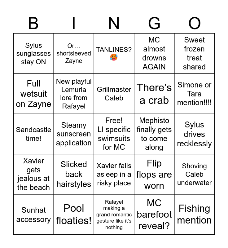 This bingo card has a free space and 24 words: Slicked back hairstyles, Pool floaties!, Grillmaster Caleb, Sunhat accessory, Sweet frozen treat shared, Sylus sunglasses stay ON, Full wetsuit on Zayne, Or… shortsleeved Zayne, Mephisto finally gets to come along, Xavier falls asleep in a risky place, There’s a crab, Sandcastle time!, Flip flops are worn, Shoving Caleb underwater, New playful Lemuria lore from Rafayel, MC barefoot reveal?, Sylus drives recklessly, TANLINES? 🥵, Simone or Tara mention!!!!, Steamy sunscreen application, Fishing mention, Xavier gets jealous at the beach, MC almost drowns AGAIN and Rafayel making a grand romantic gesture like it’s nothing.