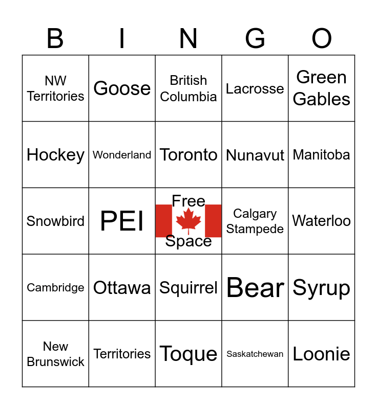 This bingo card has a free space and 51 words: Eh, Loonie, Poutine, Toque, Ottawa, Maple leaf, Goose, Moose, Hockey, Blue Jays, Wonderland, Lacrosse, Syrup, Bear, Canada, Ontario, Toronto, Calgary Stampede, CN Tower, Green Gables, PEI, Saskatchewan, NW Territories, Nunavut, Nova Scotia, Newfoundland & Labrador, Manitoba, Alberta, New Brunswick, British Columbia, Quebec, Yukon, July 1st, Justin, Province, Territories, Toonie, Curling, Niagara Falls, Kitchener, Waterloo, Cambridge, Guelph, Beaver Tail, Double-double, Nanaimo bars, Snowbird, Timbits, Sorry, Squirrel and Thank you.