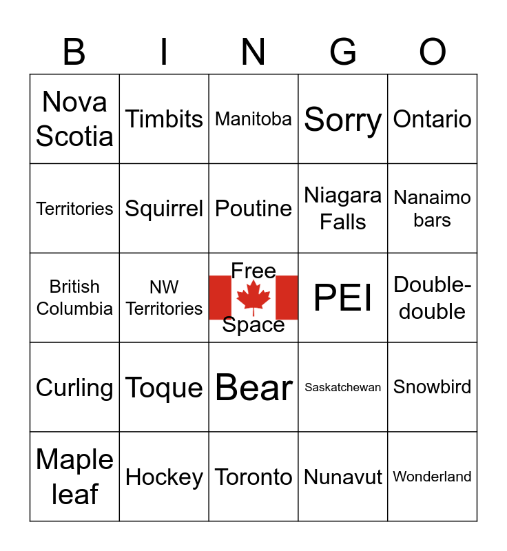 This bingo card has a free space and 51 words: Yukon, Wonderland, Waterloo, Toronto, Toque, Toonie, Timbits, Thank you, Territories, Syrup, Squirrel, Sorry, Snowbird, Saskatchewan, Quebec, Province, Poutine, PEI, Ottawa, Ontario, NW Territories, Nunavut, Nova Scotia, Niagara Falls, Newfoundland & Labrador, New Brunswick, Nanaimo bars, Moose, Maple leaf, Manitoba, Loonie, Lacrosse, Kitchener, Justin, July 1st, Hockey, Guelph, Green Gables, Goose, Eh, Double-double, Curling, CN Tower, Canada, Cambridge, Calgary Stampede, British Columbia, Blue Jays, Beaver Tail, Bear and Alberta.
