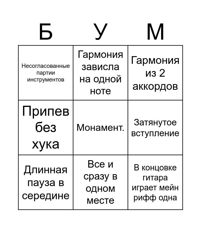 This bingo card has a free space and 8 words: Затянутое вступление, Гармония из 2 аккордов, Гармония зависла на одной ноте, Длинная пауза в середине, Несогласованные партии инструментов, В концовке гитара играет мейн рифф одна, Припев без хука and Все и сразу в одном месте.