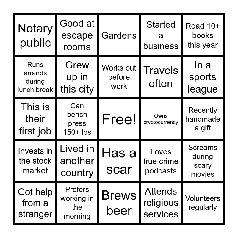 This bingo card has a free space and 145 words: Knows ASL, Appeared in a movie, Met a celebrity, Owns a gaming computer, Has an unusual family tradition, Loves true crime podcasts, Likes pineapple on pizza, Been on a bad blind date, Proposed to spouse in public, Been to Disney this year, Loves roller coasters, Does Yoga, Can do a cartwheel, Rides horses, Knows martial arts, Started a club, Attended a concert this year, Has been to the Olympics, Has been on a reality show, Has been on a road trip, Sends Christmas cards, Screams during scary movies, Loves karaoke, Was lead in a play, Can hula hoop, Can bench press 150+ lbs, Good at escape rooms, Has been skydiving, Won an eating competition, Wearing funny socks, Won at a casino, Same birth month as you, Collects something, Recently handmade a gift, Received an award, Has performed in public, Has a BFF from high school, Listens to podcasts, Travels often, Has food allergies, Belongs to a club, Named after a relative, Has a scar, Has broken a bone, Has a nickname, Birthday is on a holiday, Has a bucket list, Makes New Year’s resolutions, Good cook, Taught a class, Had a secret admirer, Helped a stranger, Got help from a stranger, Worked at a family business, Visited 4+ continents, Had a long-distance relationship, Took dance lessons, Speaks 2+ languages, Can code, Won a contest, Gardens, Traveled in the last year, Can bake a cake from scratch, Can do basic car repairs, Was in a wedding party this year, Owns cryptocurrency, Invests in the stock market, Climbed a mountain, Moved in the past year, Owns a boat, Has a big backyard, Digital nomad, Notary public, Lives near a coffee shop, Lives in a rural area, Can drive stick, Reads newspapers, Does stand up comedy, Owns a vacation house, Started a business, Firefighter or EMT, Has been in a hot air balloon, Has taken a cruise, Won a race, Ran in a marathon, Has a side hustle, Regularly writes reviews, Watches documentaries, Knows calligraphy, Brews beer, Built an app, Mixologist, Has a snack stash, Drinks 3+ cups coffee a day, Prefers working in the morning, Prefers working at night, Has worked here <1 year, Has had an 1hr+ commute, This is their first job, Bikes to work, Carpools, Runs errands during lunch break, Buys coffee every morning, Buys lunch every day, Played prank on a coworker, Works out before work, Works out after work, Only child, Twin or triplet, Comes from a big family, Military family, Lived in another country, Hand-made an outfit, In a sports league, Plays an instrument, Volunteers regularly, Read 10+ books this year, Wears contacts, Has a cat, Has a dog, Runs regularly, Has an unusual hobby, Lives with roommates, Has a tattoo, Attends religious services, Is left-handed, Has been scuba diving, Double-jointed, Uses a paper planner, Vegetarian, Introvert, Extrovert, Creates art, Enjoys meeting new people, Met partner through online dating, Writer, Quit a bad habit recently, Has a sweet tooth, Has a hidden talent, Child of immigrants, Grew up in this city, Midwestern, Southern, From the west coast and From the east coast.