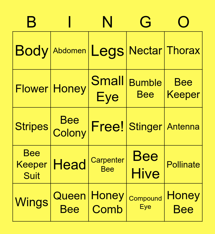 This bingo card has a free space and 24 words: Wings, Head, Small Eye, Compound Eye, Thorax, Body, Abdomen, Legs, Stinger, Antenna, Stripes, Honey, Bee Hive, Pollinate, Flower, Queen Bee, Honey Comb, Nectar, Bee Keeper, Bee Keeper Suit, Bee Colony, Carpenter Bee, Bumble Bee and Honey Bee.