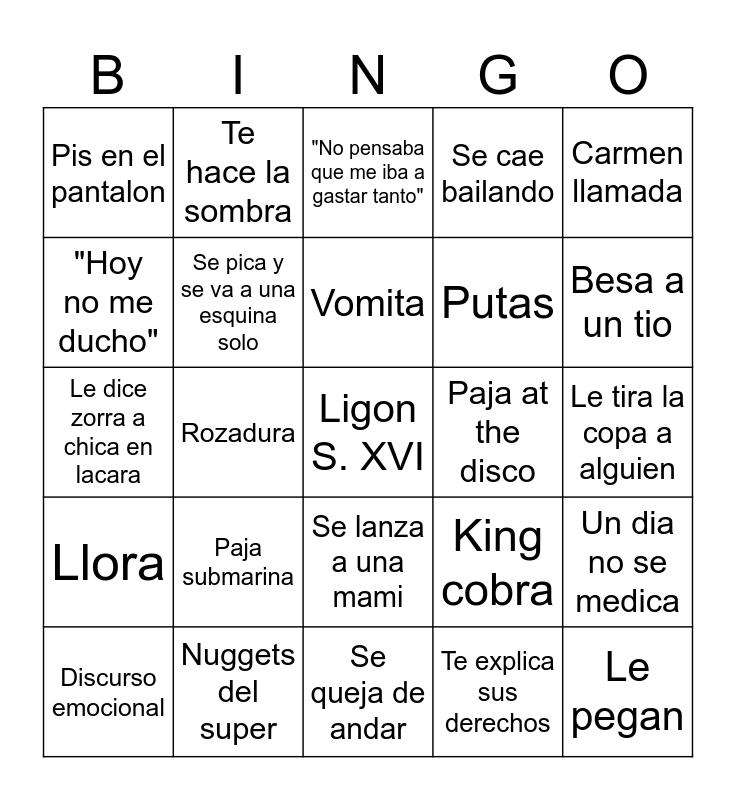 This bingo card has 25 words: Paja submarina, Se queja de andar, Vomita, Discurso emocional, Carmen llamada, Pis en el pantalon, "Hoy no me ducho", Te hace la sombra, Paja at the disco, Se lanza a una mami, Putas, Le dice zorra a chica en lacara, King cobra, Un dia no se medica, Se pica y se va a una esquina solo, Le pegan, Le tira la copa a alguien, "No pensaba que me iba a gastar tanto", Besa a un tio, Rozadura, Ligon S. XVI, Nuggets del super, Llora, Se cae bailando and Te explica sus derechos.