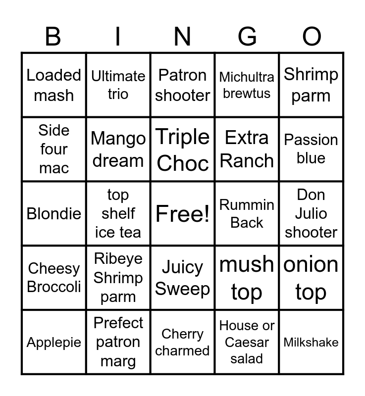 This bingo card has a free space and 24 words: Ribeye Shrimp parm, Prefect patron marg, Triple Choc, Applepie, Shrimp parm, Loaded mash, Side four mac, Ultimate trio, Rummin Back, Juicy Sweep, Extra Ranch, Blondie, mush top, onion top, Mango dream, House or Caesar salad, Don Julio shooter, Patron shooter, Passion blue, top shelf ice tea, Milkshake, Cheesy Broccoli, Michultra brewtus and Cherry charmed.