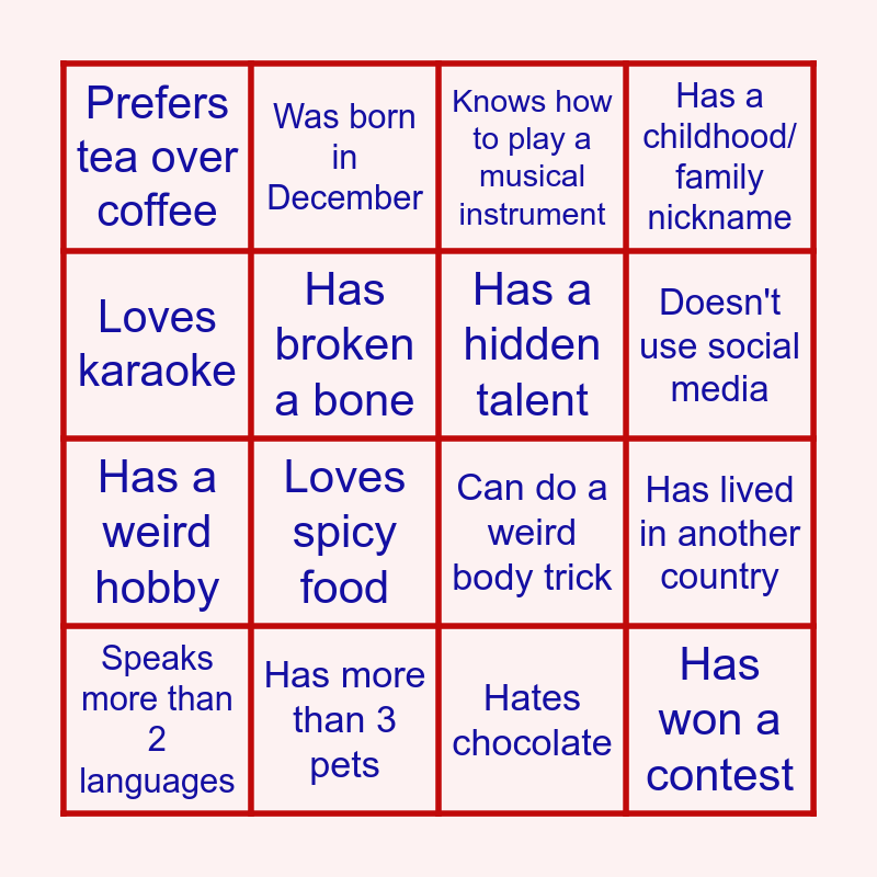 This bingo card has 16 words: Has more than 3 pets, Has lived in another country, Knows how to play a musical instrument, Prefers tea over coffee, Has a weird hobby, Was born in December, Can do a weird body trick, Hates chocolate, Loves karaoke, Has broken a bone, Speaks more than 2 languages, Has a childhood/ family nickname, Loves spicy food, Doesn't use social media, Has a hidden talent and Has won a contest.