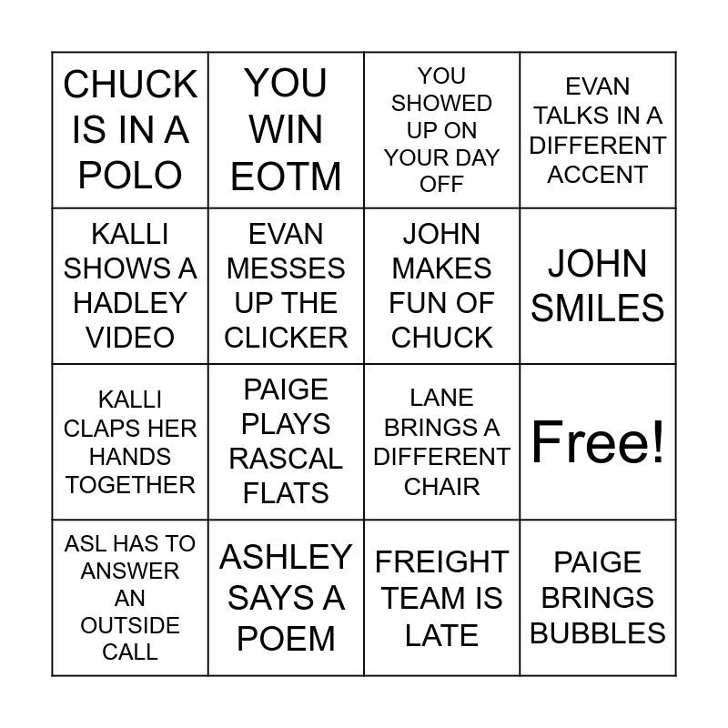 This bingo card has 20 words: Free!, THANK KAITLYN FOR ORDERING BREAKFAST, YOU SHOWED UP ON YOUR DAY OFF, SHELBY IS WEARING A SWEATSHIRT, ASL HAS TO ANSWER AN OUTSIDE CALL, KALLI SHOWS A HADLEY VIDEO, ASHLEY SAYS A POEM, CHUCK IS IN A POLO, KALLI CLAPS HER HANDS TOGETHER, YOU WIN EOTM, PAIGE PLAYS RASCAL FLATS, LANE BRINGS A DIFFERENT CHAIR, EVAN MESSES UP THE CLICKER, PAIGE BRINGS BUBBLES, JOHN MAKES FUN OF CHUCK, CHUCK SAYS THE WORD 'INCREDIBLE', JOHN SMILES, EVAN TALKS IN A DIFFERENT ACCENT, FREIGHT TEAM IS LATE and LARS IS HERE ON HIS DAY OFF.