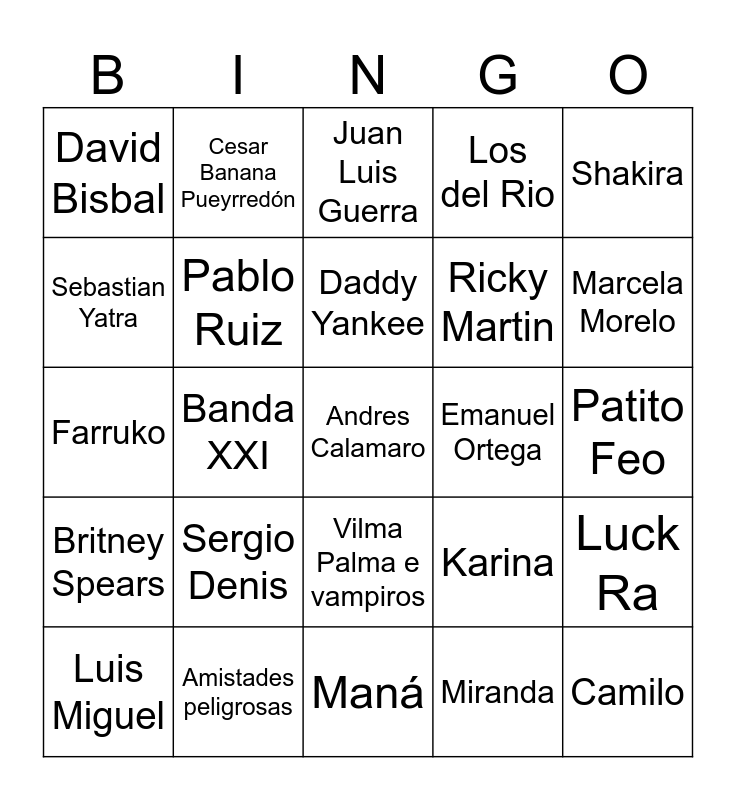 This bingo card has 55 words: Alejandro Sanz, Luis Miguel, Twiggy, David Bisbal, Maná, Coldplay, Pablo Ruiz, The Beatles, Ricky Martin, Gilda, Los del Rio, Diego Torres, Azucar Moreno, Chayanne, Los Palmeras, Amar Azul, Shakira, Banda XXI, Abba, Andres Calamaro, Emanuel Ortega, Cristian Castro, Karina, Juan Luis Guerra, Village People, Daddy Yankee, Miranda, La Oreja de Van Gogh, Patito Feo, Luck Ra, Lali, Chocolate, Soledad, Coti, Sebastian Yatra, Farruko, Carlos Baute, Britney Spears, Camilo, Juanes, Cesar Banana Pueyrredón, Loco Mia, Sergio Dalma, Franco De Vita, Sergio Denis, Amistades peligrosas, Los fantasmas del Caribe, El SÃmbolo, Marta Sanchez, Marcela Morelo, CAE, La Zimbabwe, Jon Secada, Vilma Palma e vampiros and Proyecto Uno.