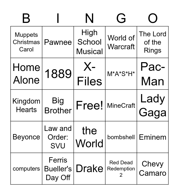 This bingo card has a free space and 39 words: Jaws, Katy Perry, $10.00, 1889, computers, the World, X-Files, Mario, The Lord of the Rings, Beyonce, Big Brother, World of Warcraft, Chevy Camaro, Lady Gaga, MineCraft, Law and Order: SVU, King Gizzard and the Lizard Wizard, Muppets Christmas Carol, The Legend of Zelda, bombshell, Home Alone, Drake, M*A*S*H*, Pac-Man, Shrek, Kelly Clarkson, car crash, Survivor, The Princess Diaries, Pawnee, Mario Kart 8, Skyfall, High School Musical, Ferris Bueller's Day Off, Red Dead Redemption 2, Central Perk, Eminem, Kingdom Hearts and Squid Game.