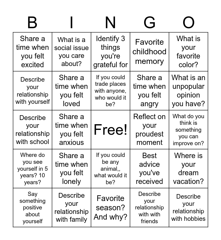 This bingo card has a free space and 24 words: Share a time when you felt lonely, Describe your relationship with family, If you could trade places with anyone, who would it be?, Say something positive about yourself, What is your favorite color?, Share a time when you felt excited, Describe your relationship with yourself, What is a social issue you care about?, Reflect on your proudest moment, If you could be any animal,, what would it be?, Share a time when you felt angry, Describe your relationship with school, Best advice you've received, Where is your dream vacation?, Share a time when you felt loved, Describe your relationship with with friends, What do you think is something you can improve on?, Identify 3 things you're grateful for, What is an unpopular opinion you have?, Share a time when you felt anxious, Describe your relationship with hobbies, Where do you see yourself in 5 years? 10 years?, Favorite childhood memory and Favorite season? And why?.
