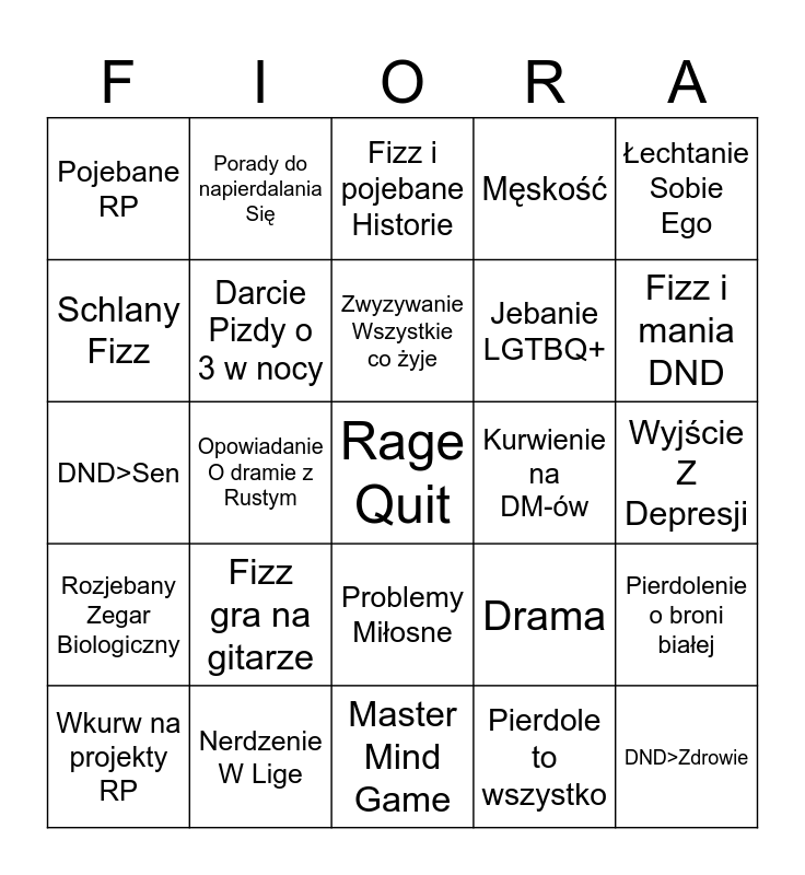 This bingo card has 25 words: Fizz gra na gitarze, Master Mind Game, Zwyzywanie Wszystkie co żyje, Wkurw na projekty RP, Łechtanie Sobie Ego, Pojebane RP, Schlany Fizz, Porady do napierdalania Się, Kurwienie na DM-ów, Problemy Miłosne, Jebanie LGTBQ+, DND>Sen, Drama, Pierdolenie o broni białej, Darcie Pizdy o 3 w nocy, DND>Zdrowie, Wyjście Z Depresji, Fizz i pojebane Historie, Fizz i mania DND, Opowiadanie O dramie z Rustym, Rage Quit, Nerdzenie W Lige, Rozjebany Zegar Biologiczny, Męskość and Pierdole to wszystko.