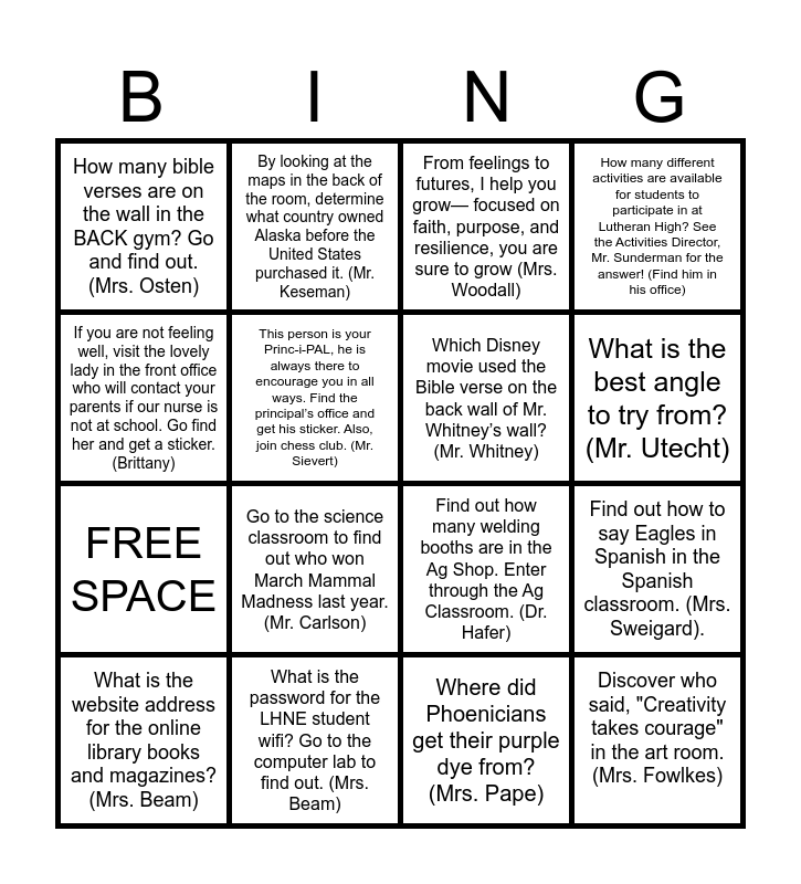 This bingo card has 16 words: What is the password for the LHNE student wifi? Go to the computer lab to find out. (Mrs. Beam), Find out how to say Eagles in Spanish in the Spanish classroom. (Mrs. Sweigard)., From feelings to futures, I help you grow— focused on faith, purpose, and resilience, you are sure to grow (Mrs. Woodall), How many bible verses are on the wall in the BACK gym? Go and find out. (Mrs. Osten), FREE SPACE, By looking at the maps in the back of the room, determine what country owned Alaska before the United States purchased it. (Mr. Keseman), Find out how many welding booths are in the Ag Shop. Enter through the Ag Classroom. (Dr. Hafer), Where did Phoenicians get their purple dye from? (Mrs. Pape), If you are not feeling well, visit the lovely lady in the front office who will contact your parents if our nurse is not at school. Go find her and get a sticker. (Brittany), This person is your Princ-i-PAL, he is always there to encourage you in all ways. Find the principal’s office and get his sticker. Also, join chess club. (Mr. Sievert), What is the website address for the online library books and magazines? (Mrs. Beam), How many different activities are available for students to participate in at Lutheran High? See the Activities Director, Mr. Sunderman for the answer! (Find him in his office), Go to the science classroom to find out who won March Mammal Madness last year. (Mr. Carlson), What is the best angle to try from? (Mr. Utecht), Which Disney movie used the Bible verse on the back wall of Mr. Whitney’s wall? (Mr. Whitney) and Discover who said, "Creativity takes courage" in the art room. (Mrs. Fowlkes).