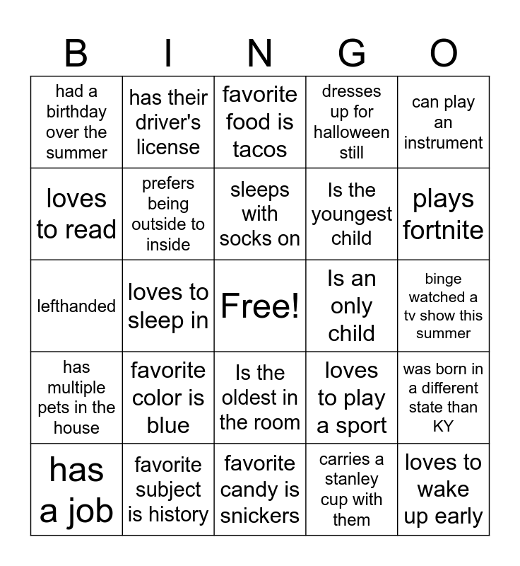 This bingo card has a free space and 24 words: favorite color is blue, favorite subject is history, sleeps with socks on, has a job, can play an instrument, had a birthday over the summer, loves to read, has their driver's license, Is an only child, Is the oldest in the room, Is the youngest child, lefthanded, loves to play a sport, was born in a different state than KY, prefers being outside to inside, carries a stanley cup with them, binge watched a tv show this summer, favorite food is tacos, plays fortnite, loves to sleep in, loves to wake up early, has multiple pets in the house, dresses up for halloween still and favorite candy is snickers.