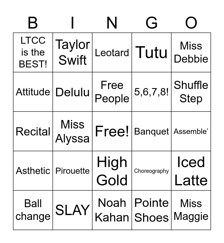 This bingo card has a free space and 26 words: High Gold, Pointe Shoes, Free People, SLAY, Miss Debbie, LTCC is the BEST!, Attitude, Taylor Swift, Assemble’, Choreography, 5,6,7,8!, Recital, Iced Latte, Ball change, Miss Alyssa, Double Platinum, Tutu, Asthetic, Leotard, Miss Maggie, Shuffle Step, Noah Kahan, Banquet, Pirouette, Delulu and POV.