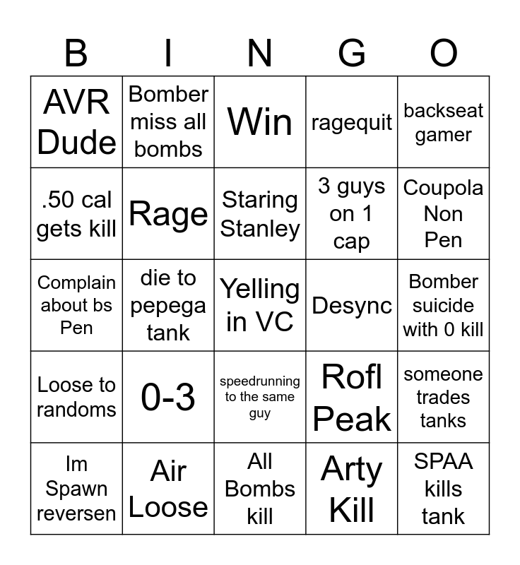 This bingo card has a free space and 24 words: 0-3, Air Loose, Staring Stanley, Im Spawn reversen, backseat gamer, AVR Dude, .50 cal gets kill, Bomber miss all bombs, Desync, speedrunning to the same guy, 3 guys on 1 cap, Complain about bs Pen, Rofl Peak, someone trades tanks, Rage, Arty Kill, Bomber suicide with 0 kill, Win, Coupola Non Pen, die to pepega tank, SPAA kills tank, Loose to randoms, ragequit and All Bombs kill.