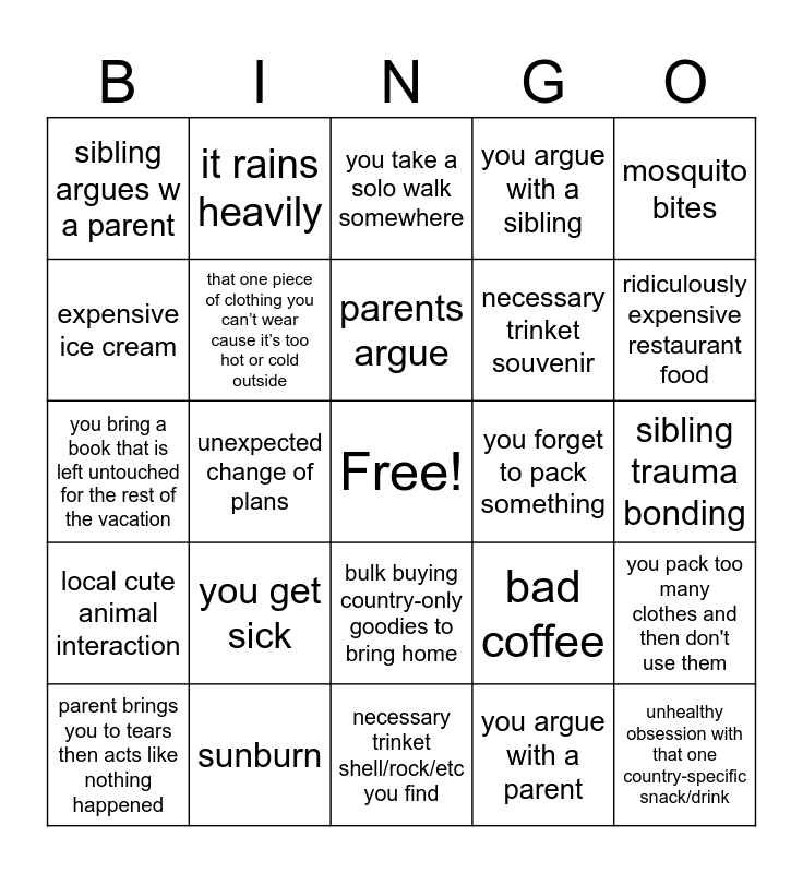 This bingo card has a free space and 24 words: you get sick, sunburn, parents argue, parent brings you to tears then acts like nothing happened, mosquito bites, sibling argues w a parent, expensive ice cream, it rains heavily, you forget to pack something, bulk buying country-only goodies to bring home, necessary trinket souvenir, you bring a book that is left untouched for the rest of the vacation, bad coffee, you pack too many clothes and then don't use them, that one piece of clothing you can’t wear cause it’s too hot or cold outside, you argue with a parent, sibling trauma bonding, you take a solo walk somewhere, ridiculously expensive restaurant food, unexpected change of plans, unhealthy obsession with that one country-specific snack/drink, local cute animal interaction, you argue with a sibling and necessary trinket shell/rock/etc you find.